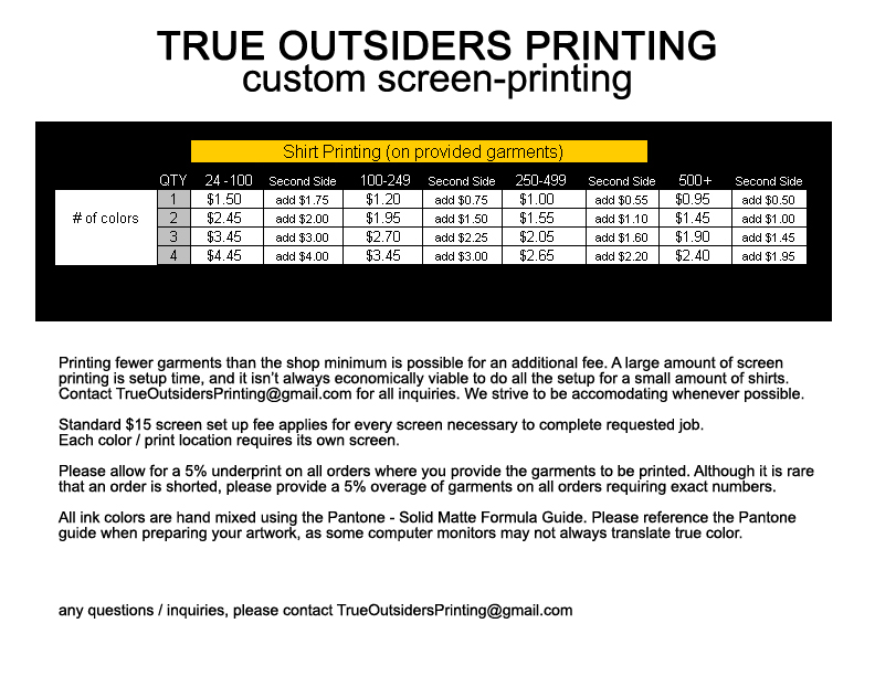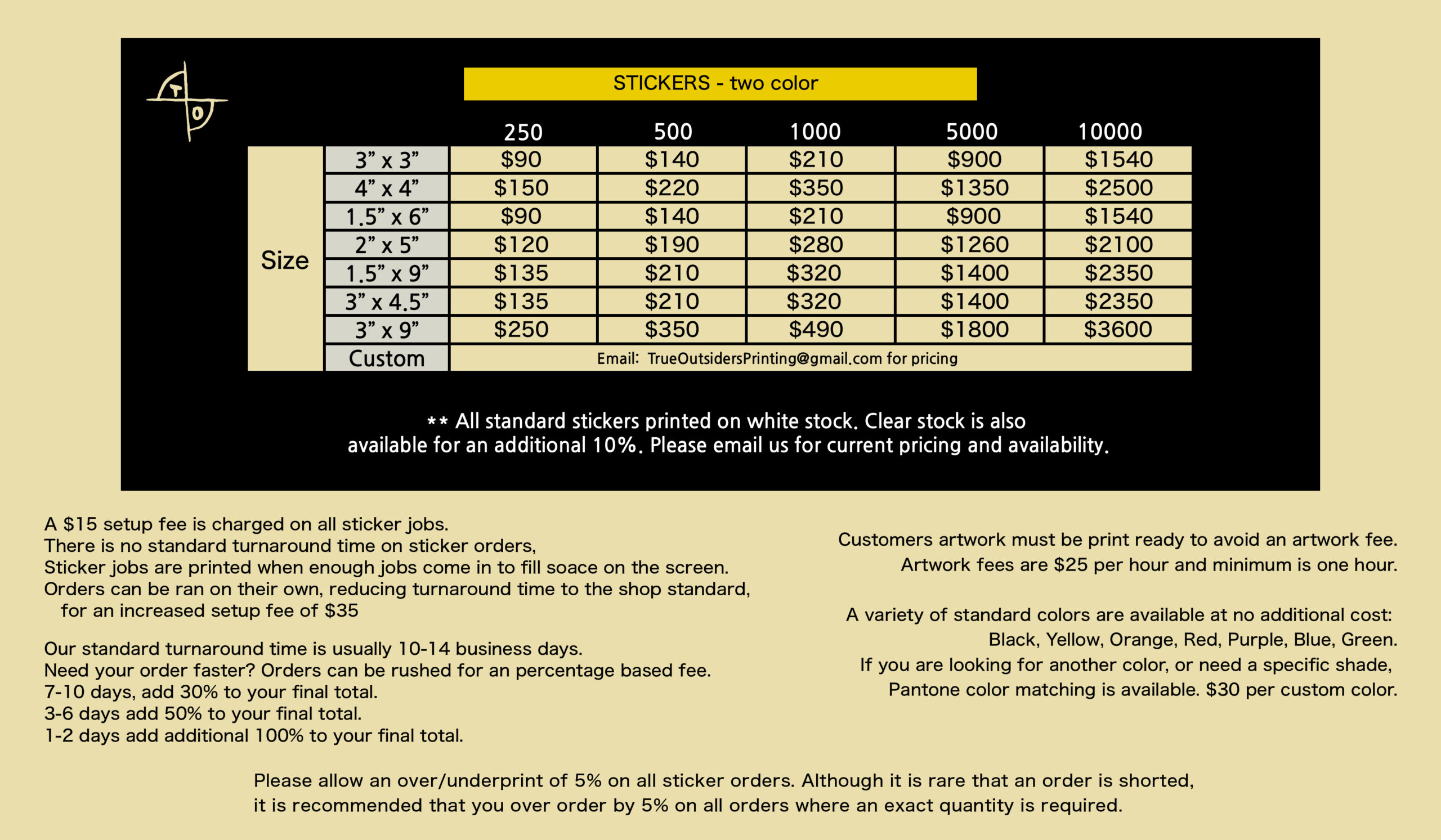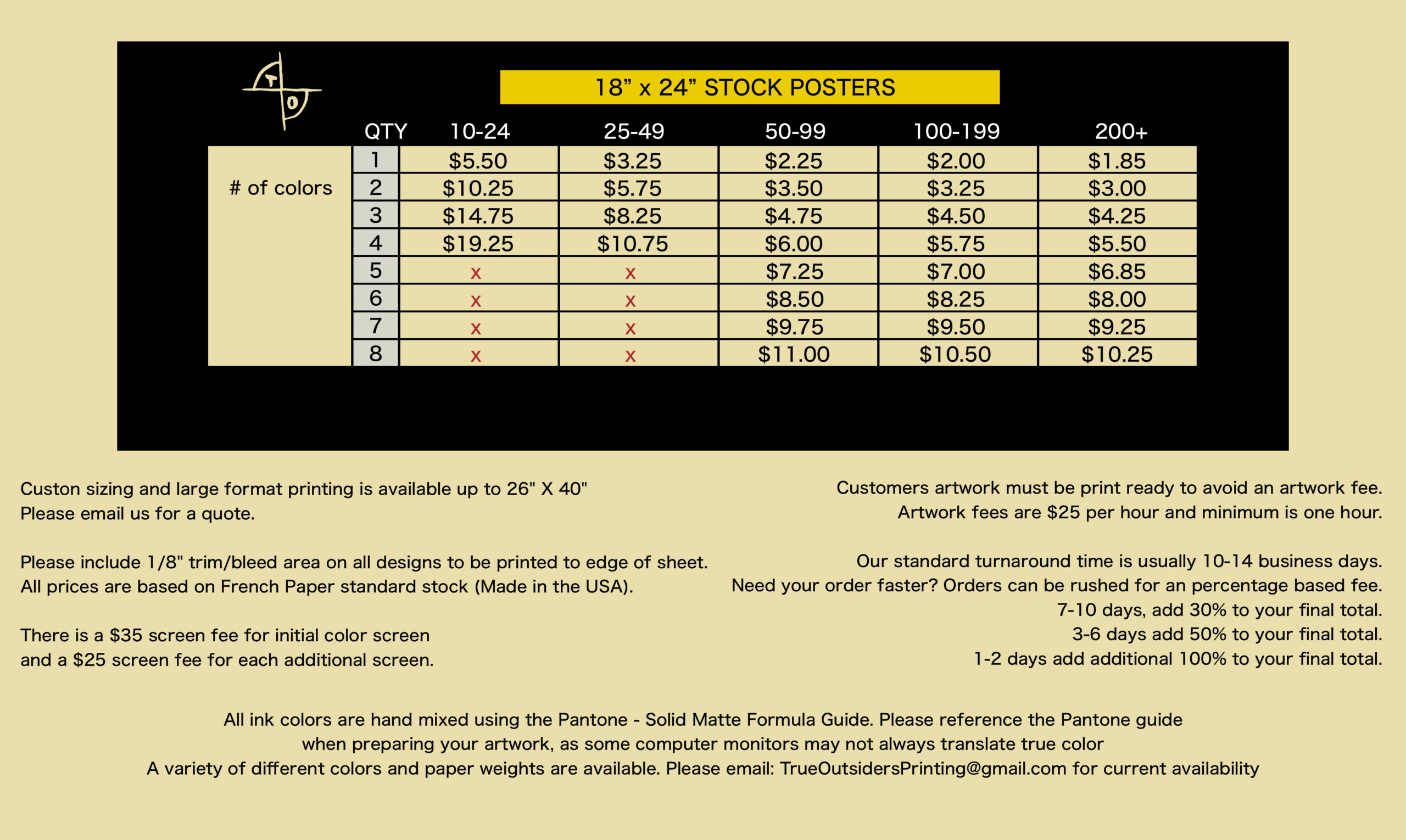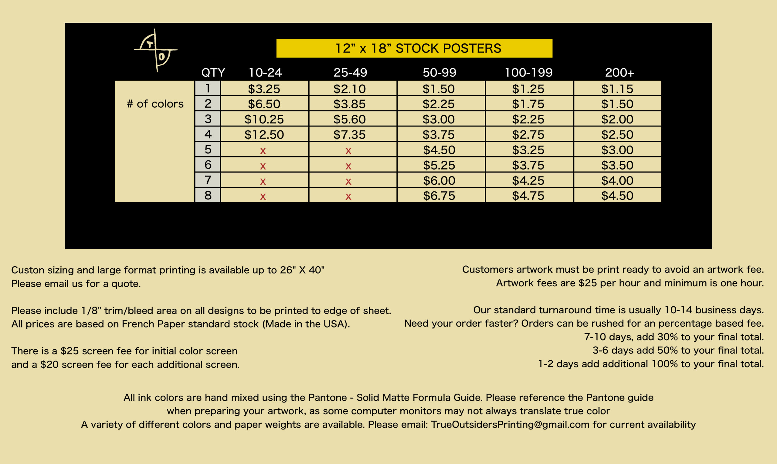 Please contact TrueOutsidersPrinting@gmail.com for quotes on products or services not currently listed on this page.