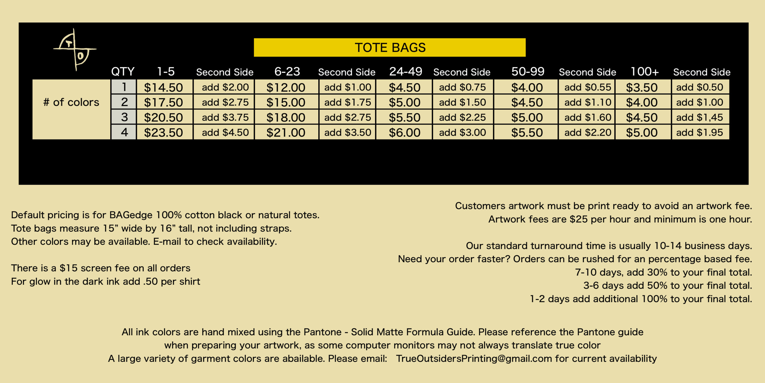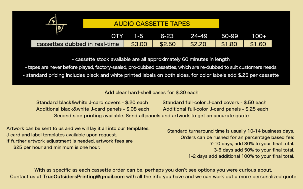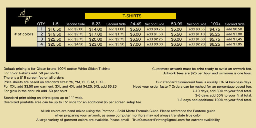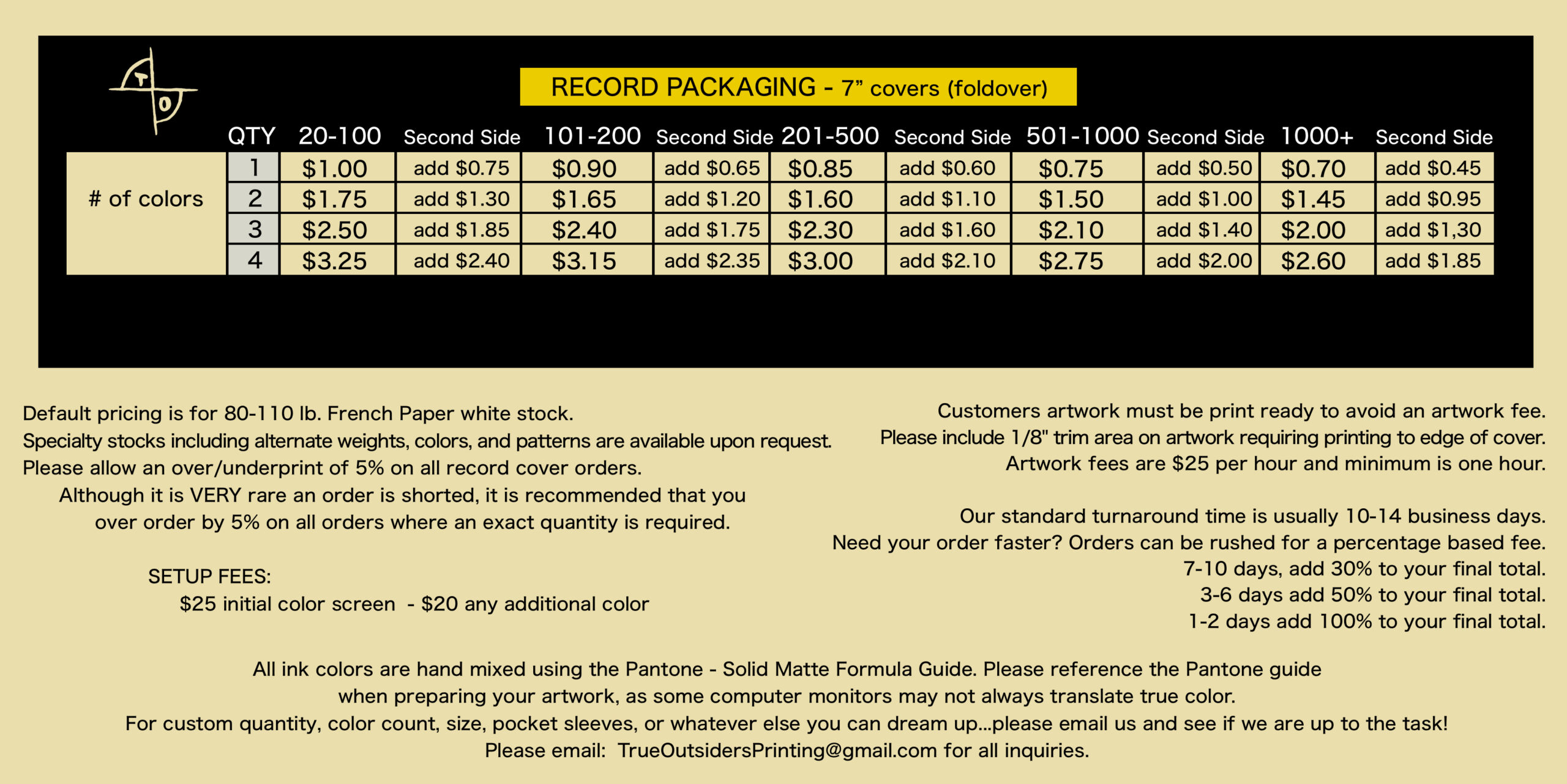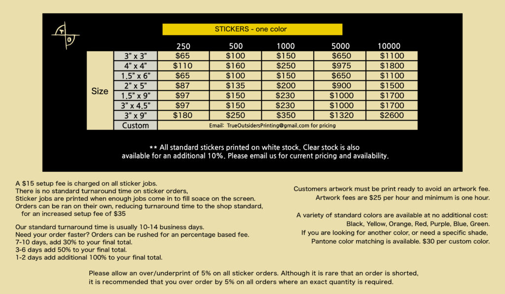 Please contact TrueOutsidersPrinting@gmail.com for quotes on products or services not currently listed on this page.